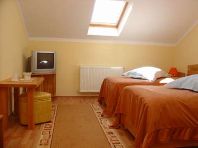 * 10 camere a cate 2 paturi in regim single sau double dotate cu baie, TV, telefon, acces internet si minibar,