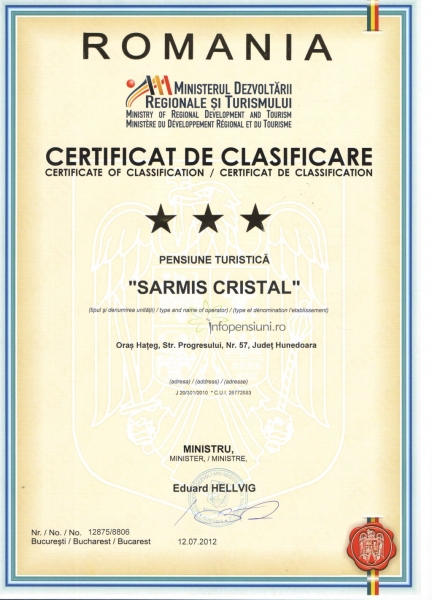 Pensiunea Sarmis Cristal clasificata la 3* cu o capacitate de 31 de locuri de cazare: 9 camere duble, 3 camere triple si 1 camera cu 4 locuri, care au in dotare bai propii, T.V. LCD, frigider, uscator de par, internet wireless, incalzire centrala.