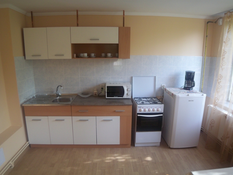 La parter se afla o bucatarie dotata cu frigider, aragaz, cuptor cu microunde, filtru de cafea, dozator de apa si 18-20 locuri la mese.