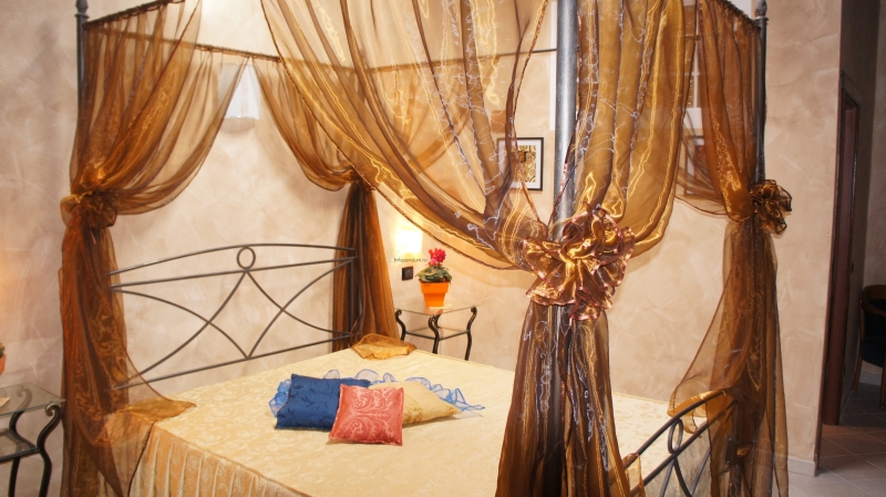 202- ANTIOCO camera suite mansardata, in nuante de maro si auriu, dispune de o zona de noapte romantica, dotata cu pat matrimonial cu baldachin si o zona de zi . Camera dispune de minibar, baie cu dus, feon, tv prin cablu, internet wi-fi . In camera pot fi admirate copii ale tablourilor lui Gustav Klimt. . Tarif camera 55 euro.