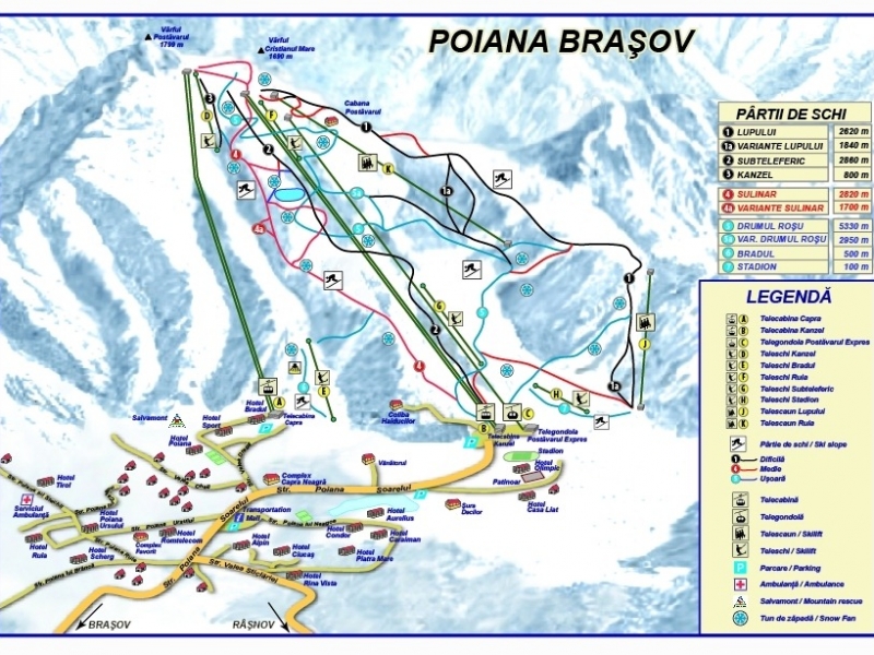 Cele mai cunoscute partii de ski din Poiana Brasov insumeaza 14.331 metri si au grade diferite de dificultate (o partie olimpica, trei partii pentru coborare si slalom urias, o partie pentru slalom sp