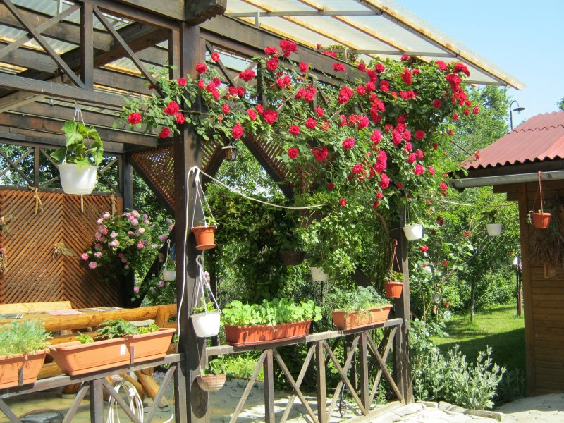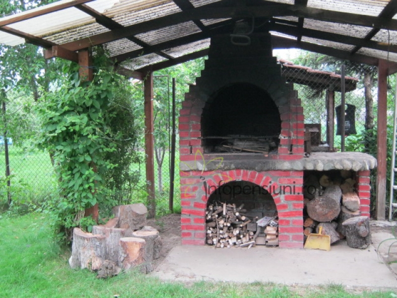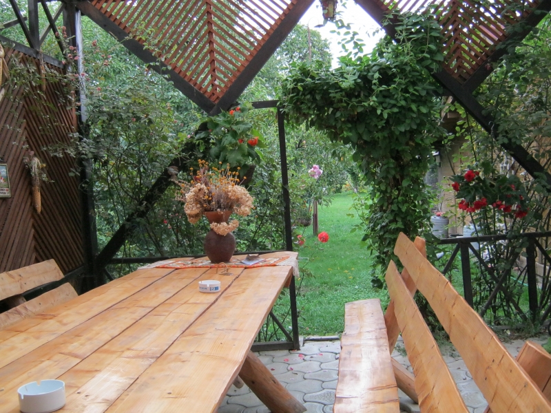 In gradina este amenajat un loc de recreere cu mese cu umbrele si scaune.