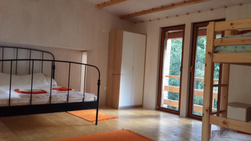 Cabana dispune de 3 camere duble si 2 camere cu 4 locuri (un pat dublu si 2 paturi suprapuse) dispuse pe 3 nivele si vedere spre padure, 3 bai, cate una pe fiecare nivel si un living spatios cu televizor si bucatarie complet utilata.